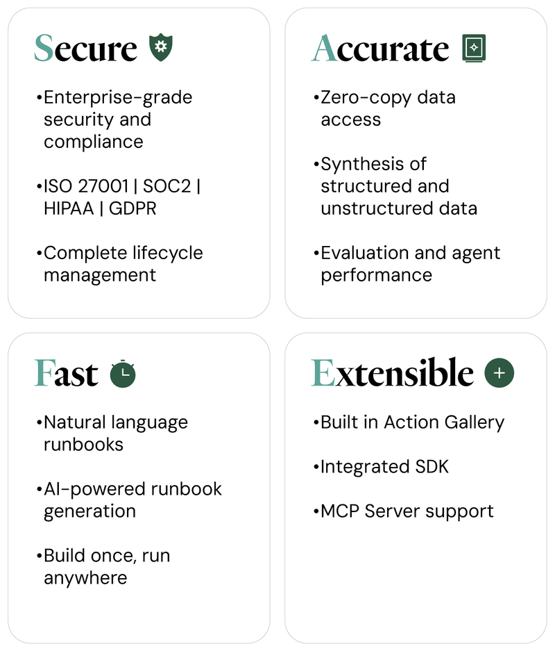 - Secure and governed: Enterprise agents must operate within defined security protocols and compliance standards (like SOC 2, ISO 27001, HIPAA, GDPR). Robust access controls and deployment options like running within a customer’s VPC are critical.