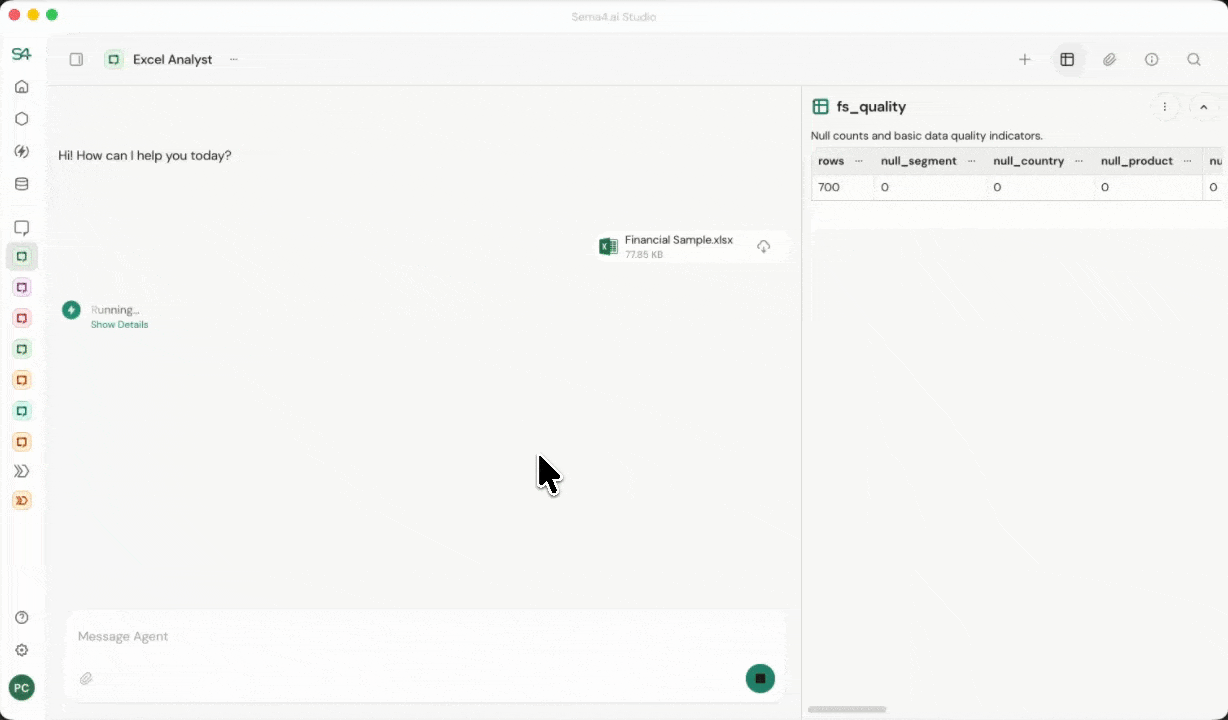 Seamless multi-source integration: Database query results, Document Intelligence extractions, and uploaded spreadsheets automatically convert to DataFrames, enabling consistent cross-source analysis across multi-step business processes.