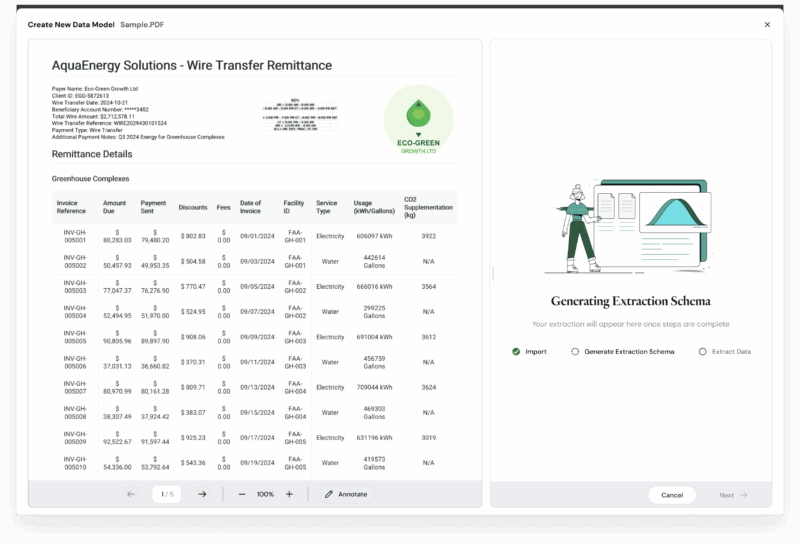 AI-guided configuration: Business users and AI collaborate through an intelligent side-by-side interface where AI automatically detects fields and tables using multi-pass parsing, then learns from user annotations and business context to consistently extract data.
