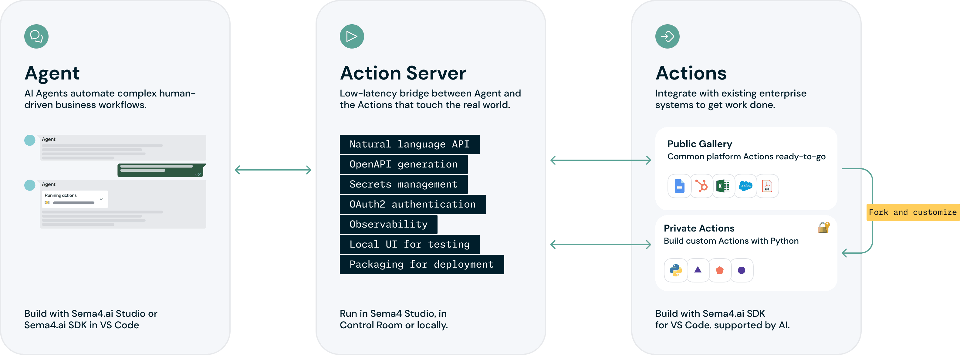 - Action Server: This service runs actions on a developer's laptop, inside the Sema4.ai Studio app, or in your organization's VPC. It ensures actions run as intended, offering features like an automatically generated natural language interface from the Action code and automated logging for better observability.
