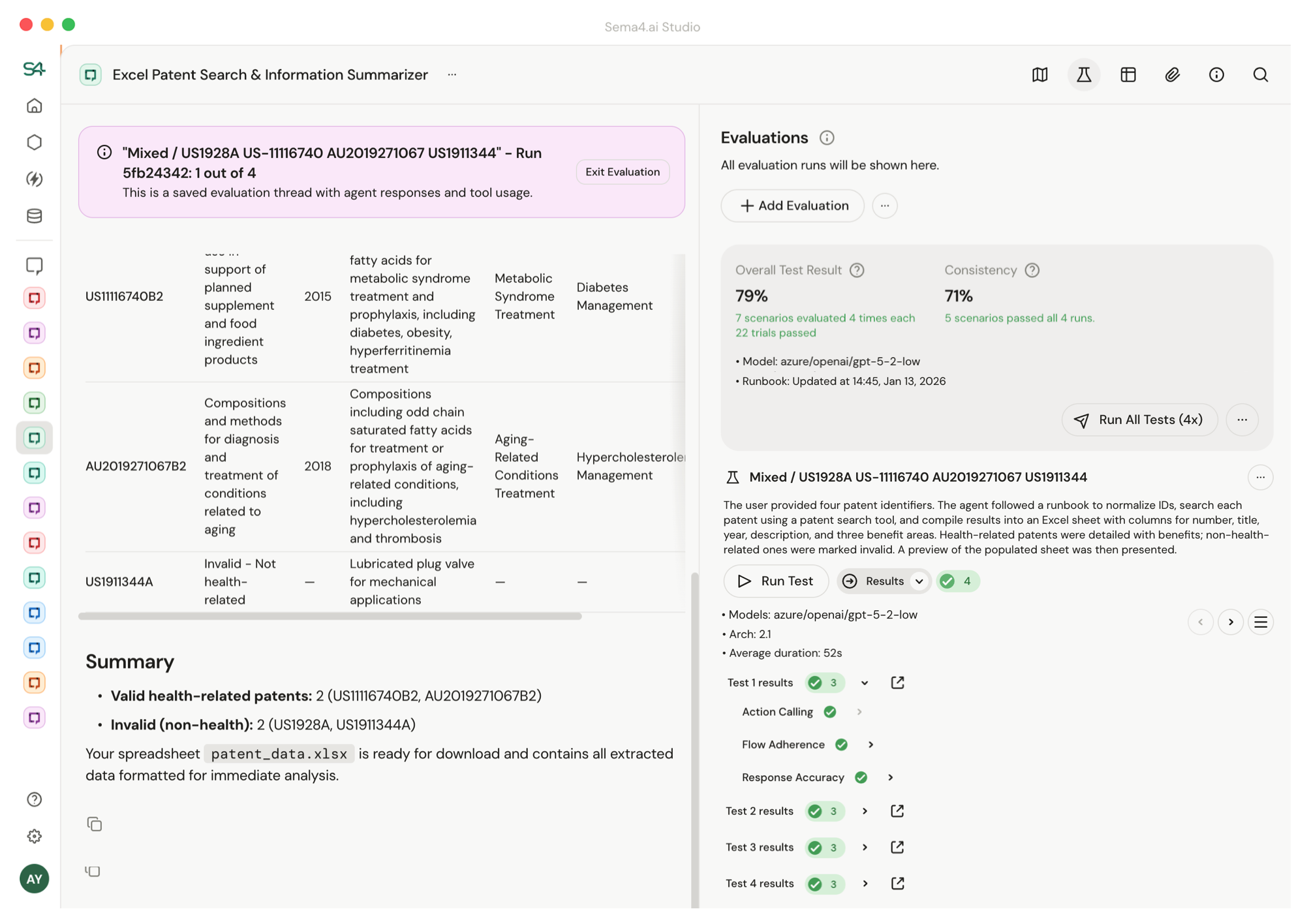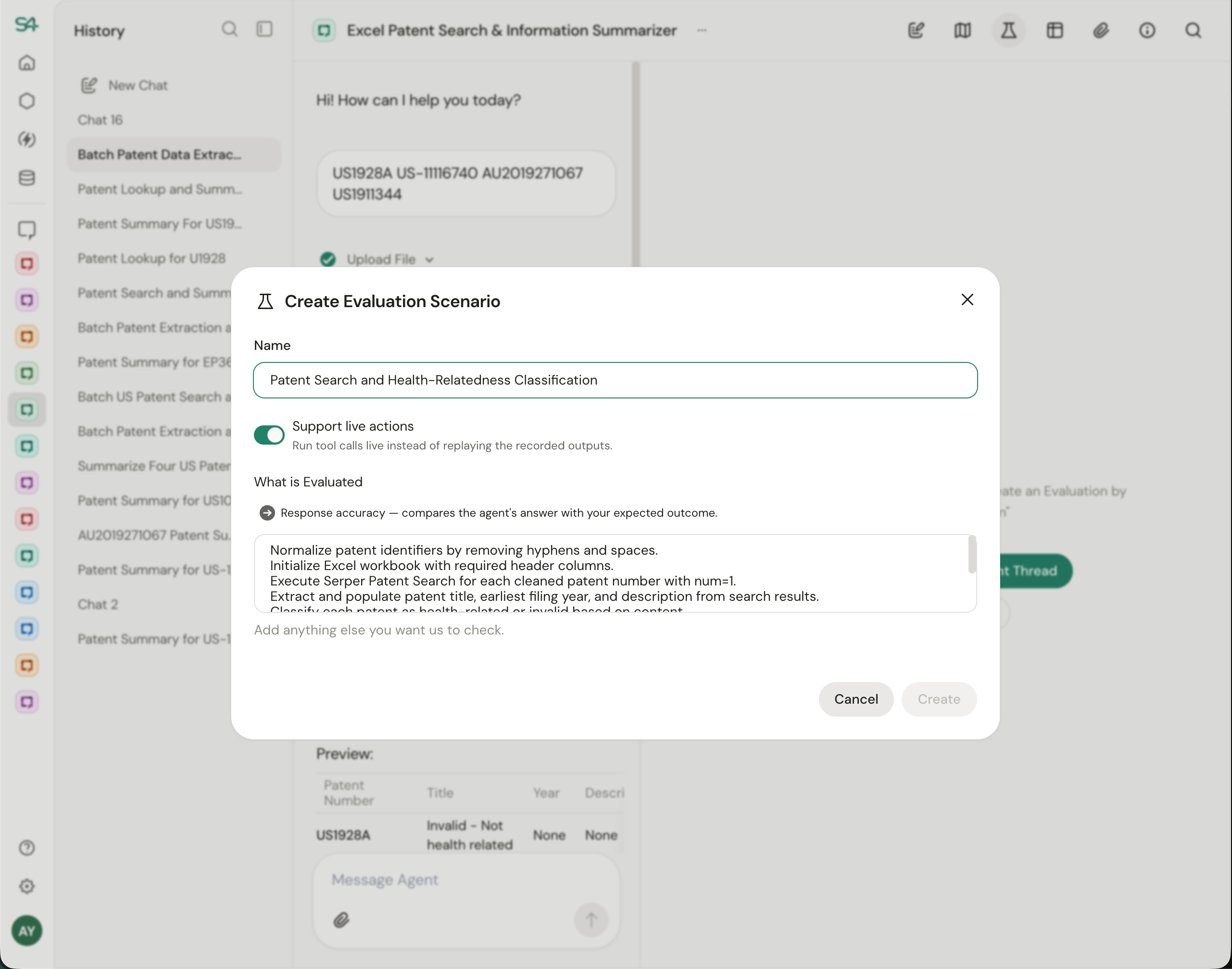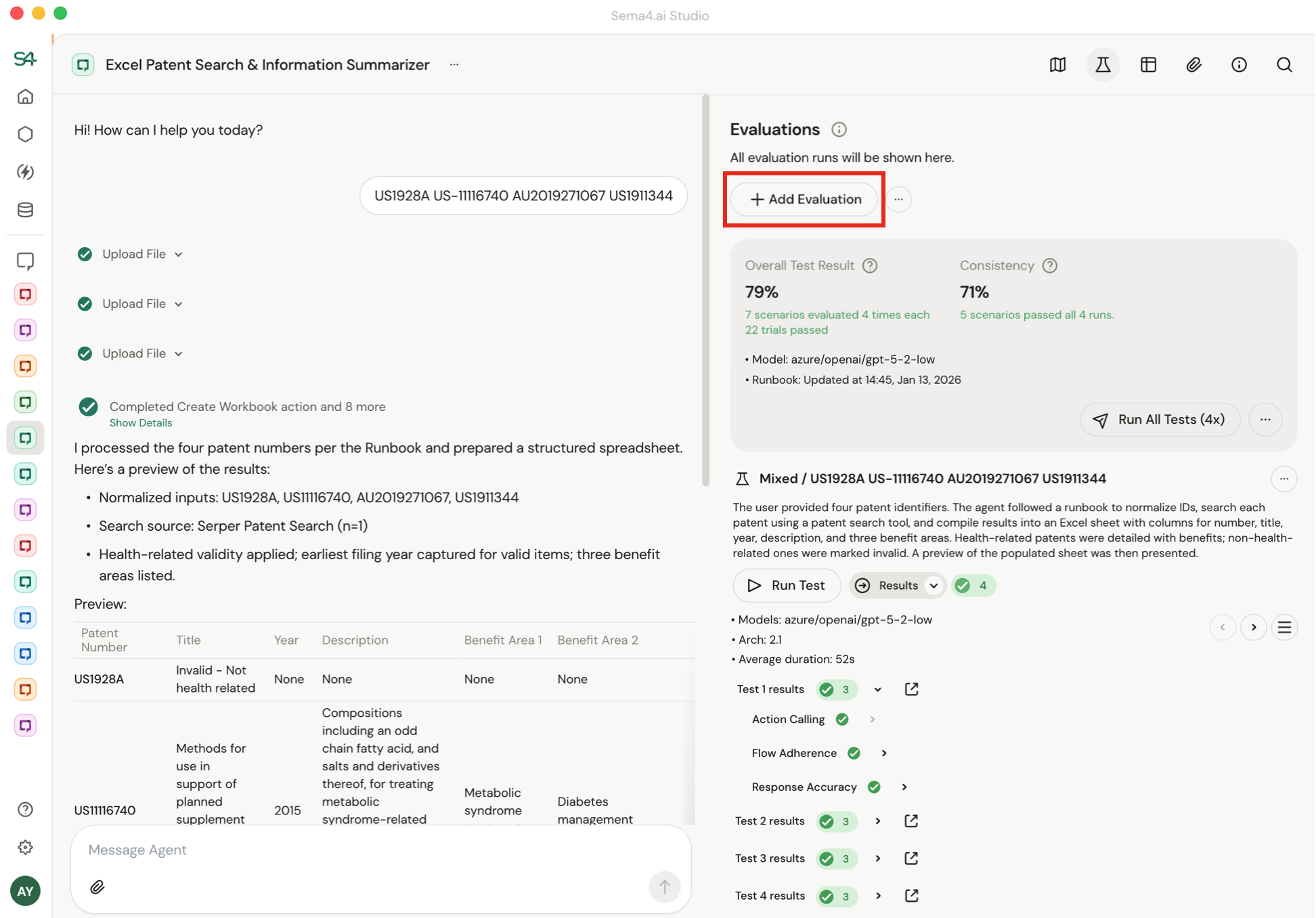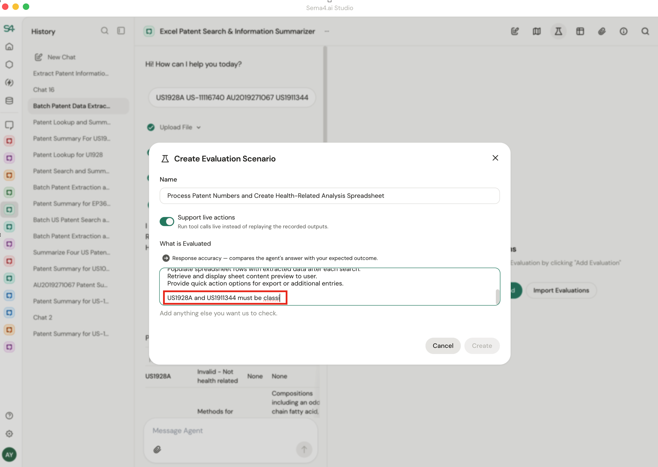 - Add criteria for stricter validation. For example, change "Create a table with results" to "Results table must include Patent #US-12354, classified as a non medical patent".