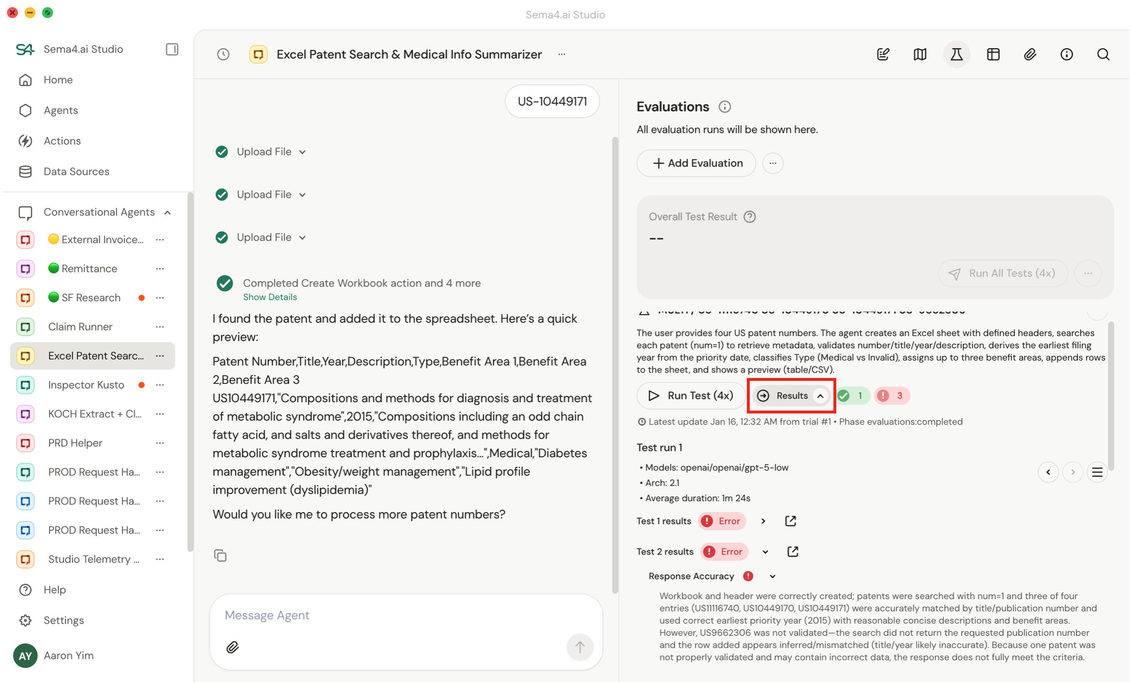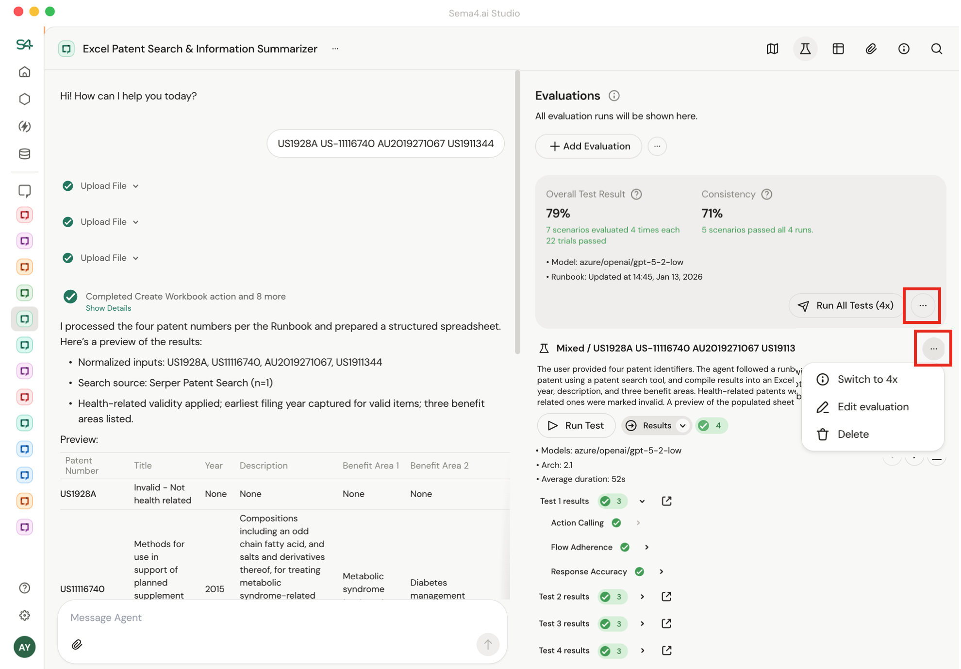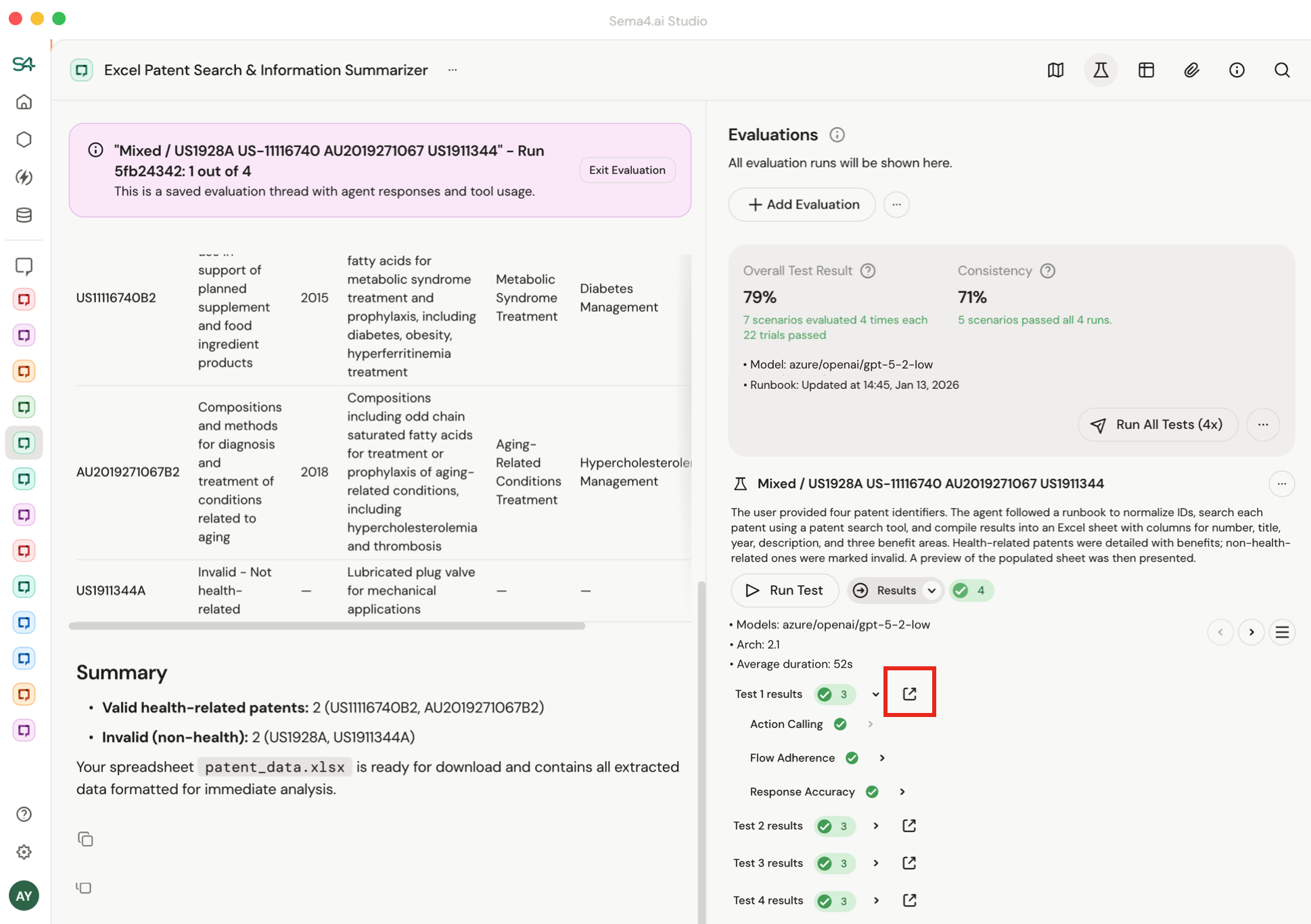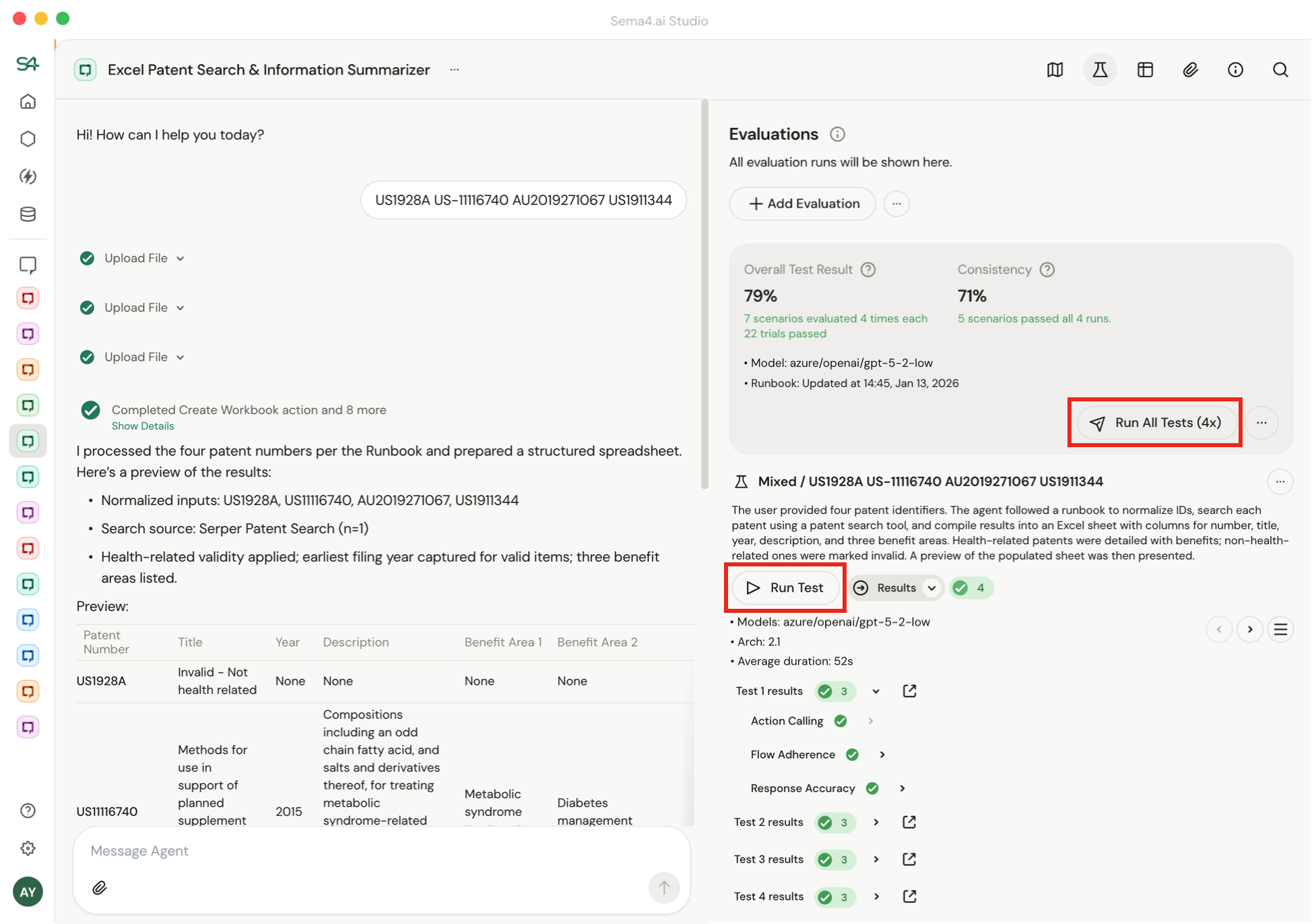 If you click "Run All", you'll get a high level accuracy and consistency number for your agent.