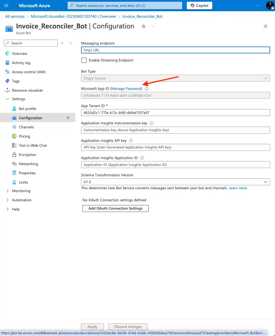 - Return to Azure bot configuration and click the Manage Password link next to Microsoft App ID